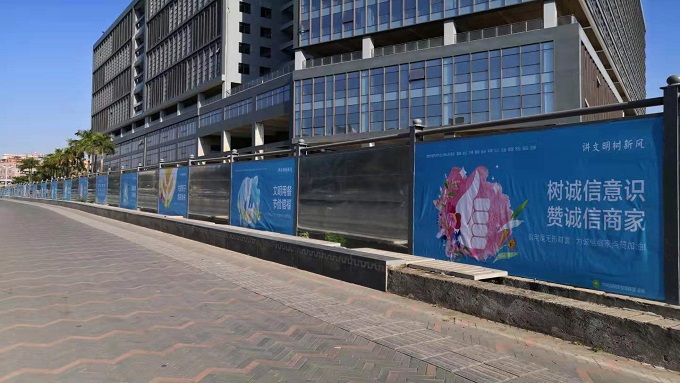 4、PVC圍擋無(wú)論酷暑嚴(yán)寒、還是雨雪風(fēng)霜,始終能保持色彩穩(wěn)定,表面光滑、色澤柔和、無(wú)光污染,親和力強(qiáng)。